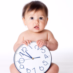 For babies over 3 months, their internal body clocks (circadian rhythms) are beginning to mature, so they may notice the change more. In the morning, try not to rush straight to them when you hear them stir. We want their little bodies to adjust to the new time, not hold on to the old one. If your baby usually wakes around 7am but is now up at 6am, wait about 10 minutes before going to them on day one, 20 minutes on day two, and gradually increase that window over the week. By the end of the week, they’ll likely be waking close to their usual time again. During the day, gently shift naps and bedtime. You might stretch awake times by 10-15 minutes on the first day, 20-30 minutes on the second, and by days 4 or 5 they’ll probably be back in sync. Remember that consistency is key – the more predictable their routine, the faster their body clock will adapt. At bedtime, aim to put them down around 15 minutes later each night (based on the new clock). By the fourth or fifth night, you’ll be fully aligned with the new time, and bedtime will feel “normal” again.